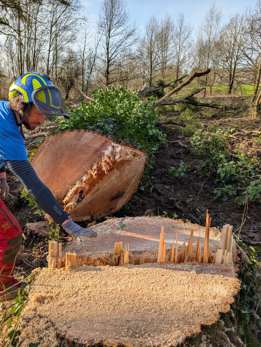 La puissance de coupe a été assurée par notre Stihl MS881, équipée d'un guide exceptionnel de 1,05 m, outil indispensable pour traverser proprement des sections de troncs aussi massives.