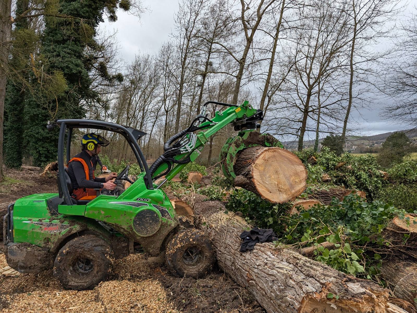 Manutention agile : Notre chargeur compact Avant 635i est intervenu pour la reprise et le déplacement des billons, assurant un dégagement rapide du site.