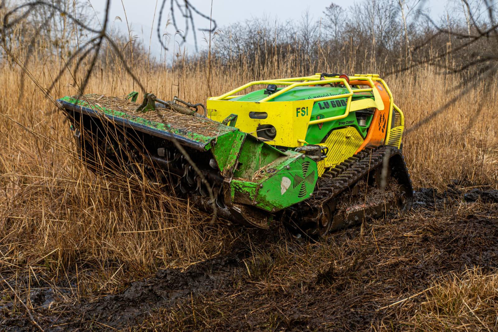 Notre machine, ici un Robot Porte-Outils équipé d’un broyeur à couteaux mobiles a parfaitement démontré sa pertinence grâce à son excellent rapport poids/puissance permettant le respect des sols. En effet, avec une pression au sol exercée de 240g/cm2 la portance permet de ne pas s’embourber. Moins d’ornière profonde limite fortement le tassement. Le tout couplé à la grande qualité de travail de l’outil et toujours à l’utilisation d’huile hydraulique biodégradable et d’un gasoil de synthèse lui aussi biodégradable. Le combo gagnant pour vos chantiers de fauchage et broyage en zones humides.